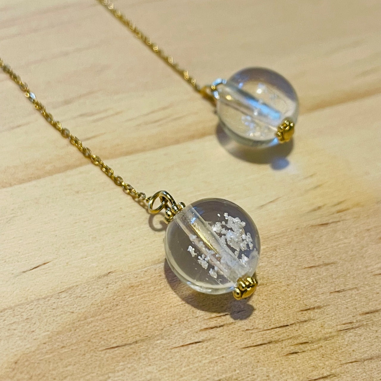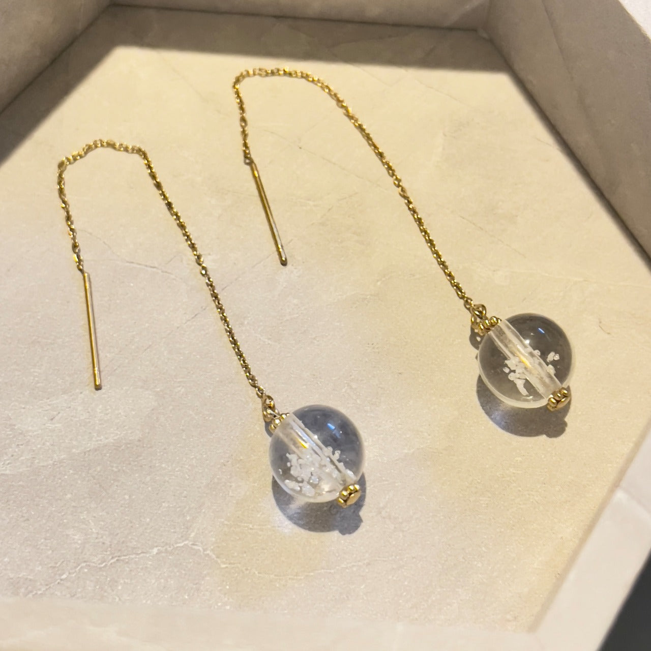透明な球体(塩珠)の中に、一つ一つ職人の手で丁寧に、大切な遺骨を入れさせて頂き仕上げた、世界に一つだけの形見ジュエリーです。