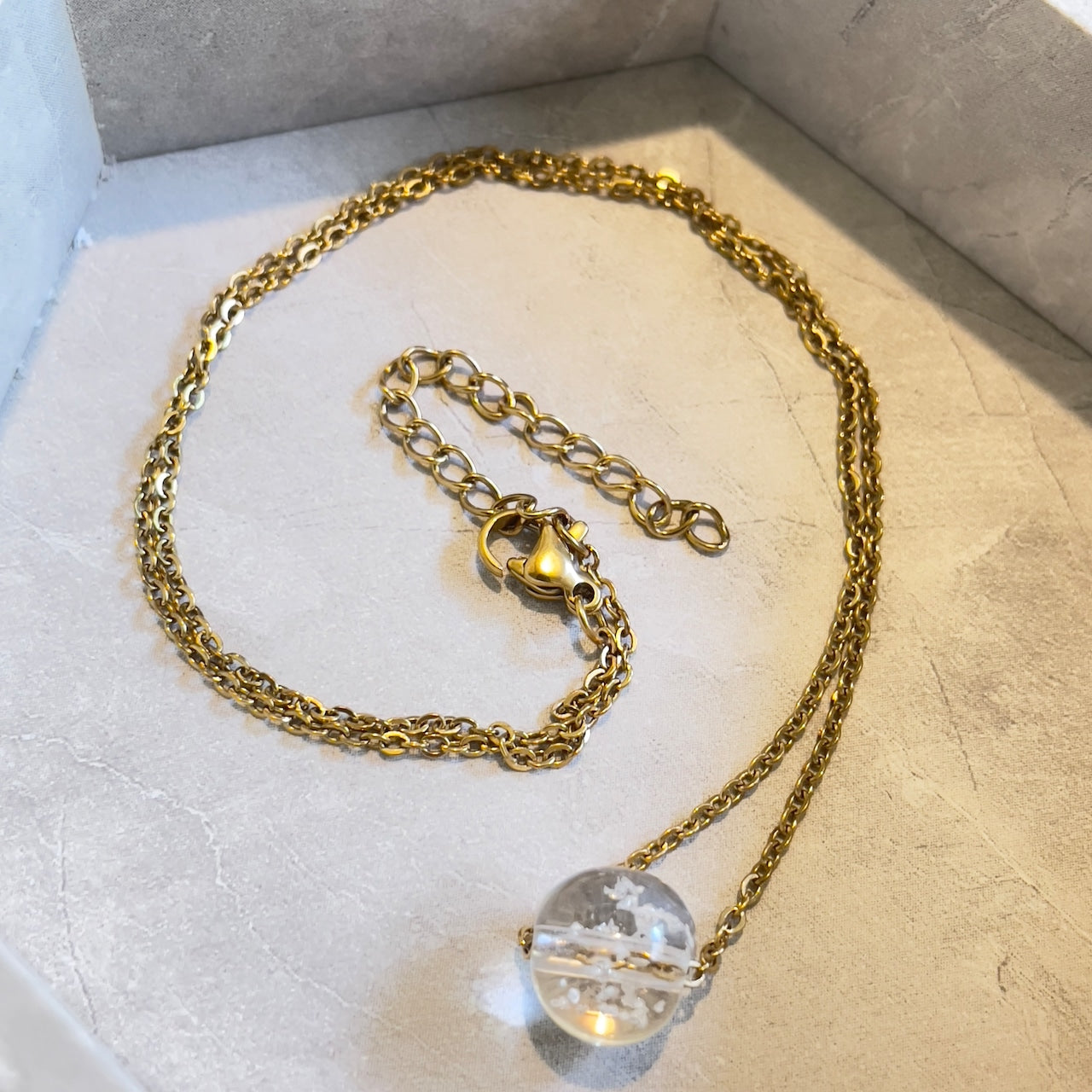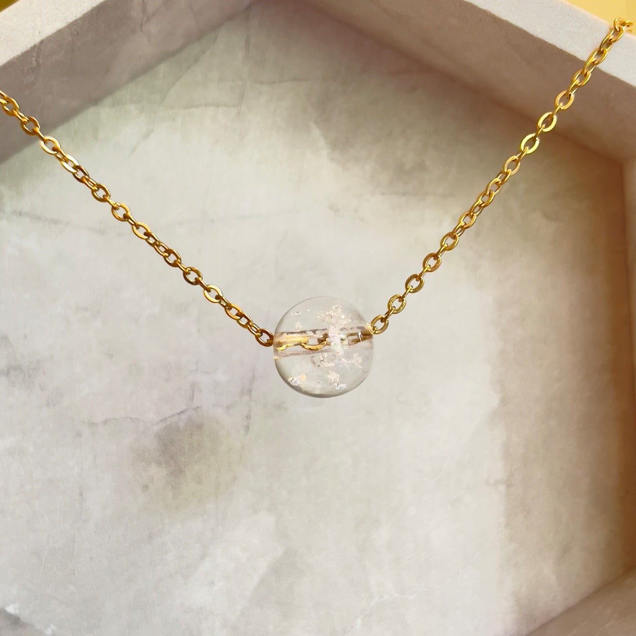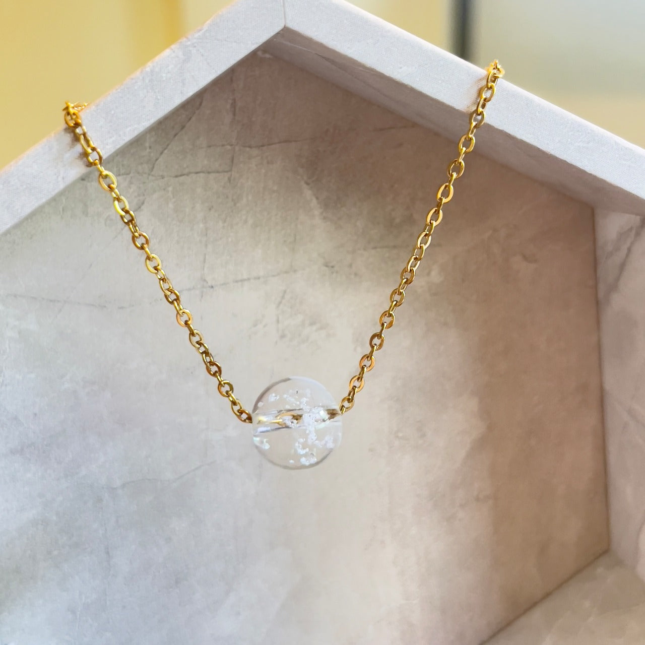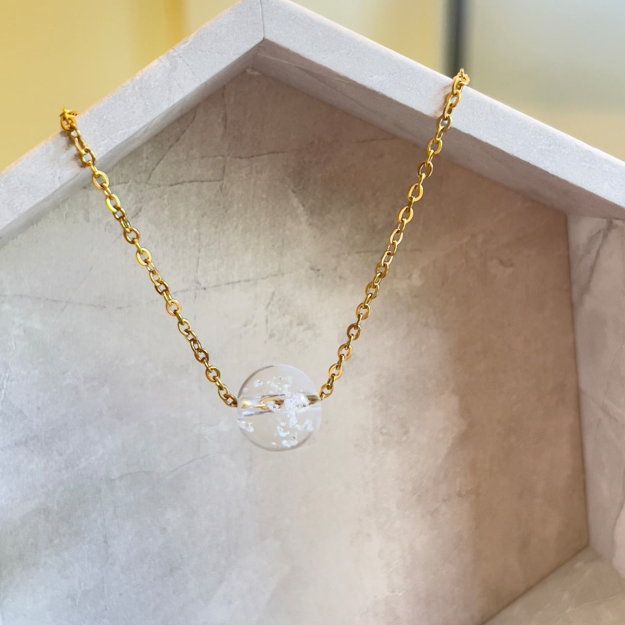 【素材】サージカルステンレス316L:【ゴールド】/【シルバー】チェーン長さ45cm+5cmアジャスター付き。10mm塩珠:ガラス素材