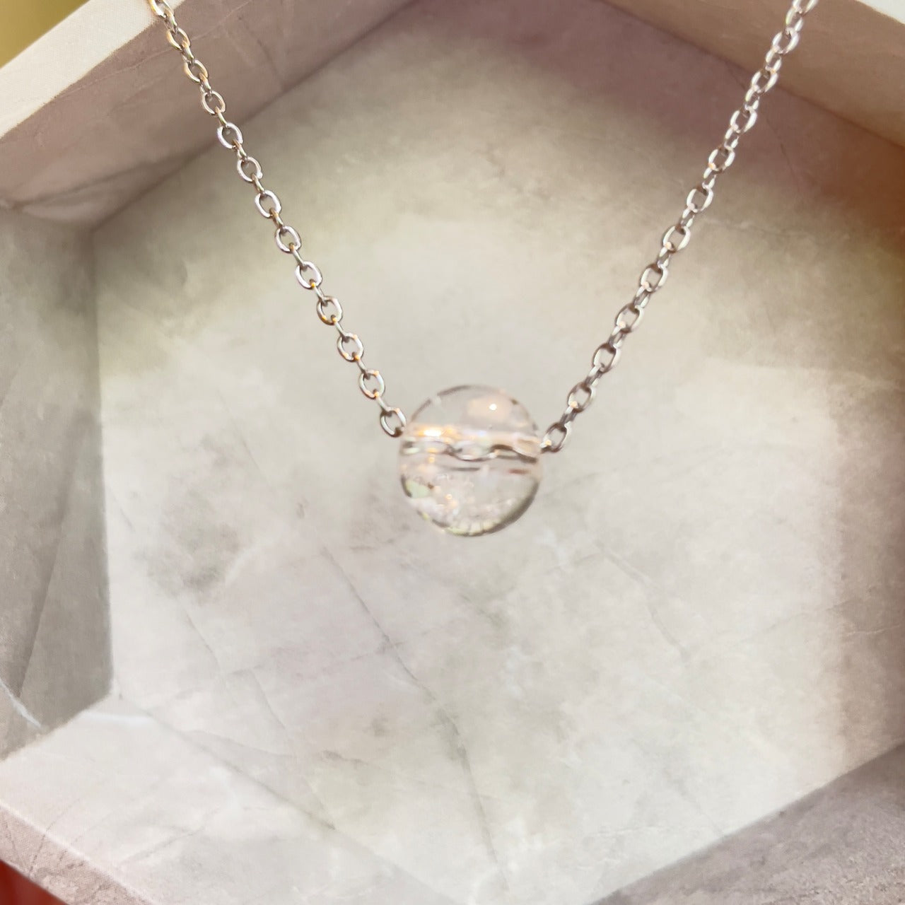 透明な球体(塩珠)の中に、一つ一つ職人の手で丁寧に、大切な遺骨を入れさせて頂き仕上げた、世界に一つだけの形見ジュエリーです。