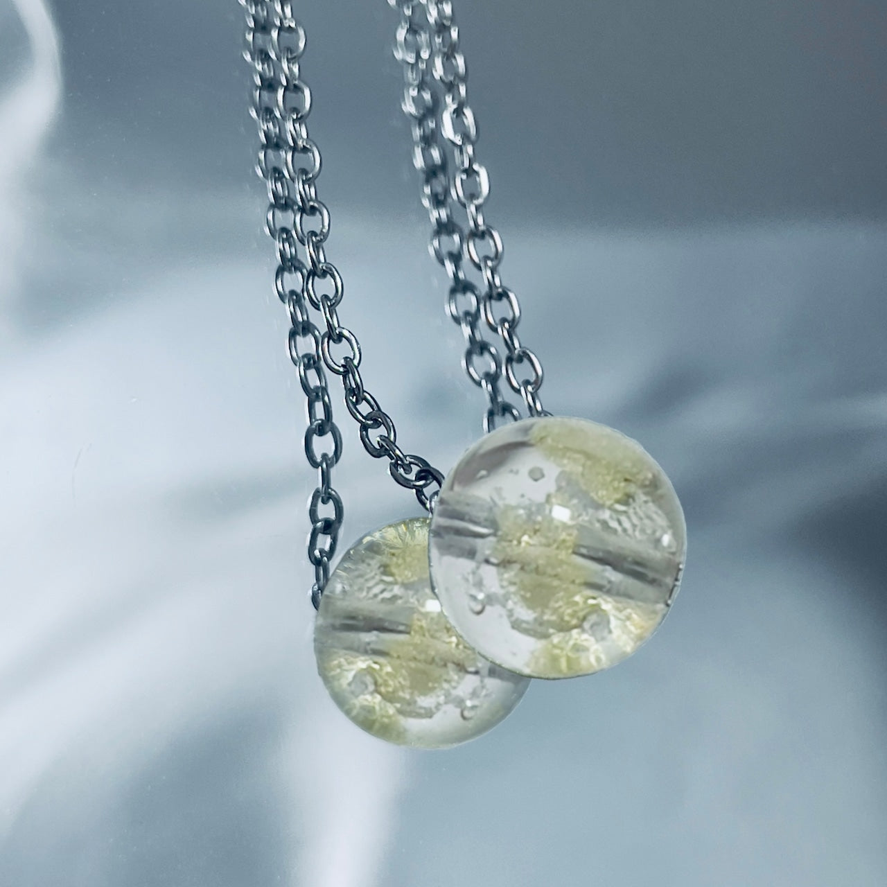 透明な球体(塩珠)の中に、一つ一つ職人の手で丁寧に、大切な遺骨を入れさせて頂き仕上げた、世界に一つだけの形見ジュエリーです。